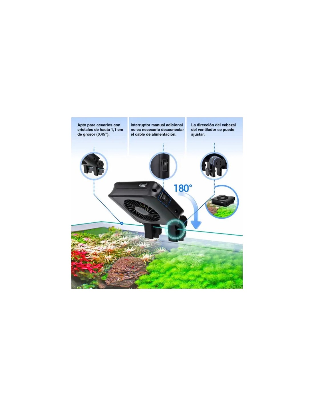 Ideal para mantener la temperatura en acuarios de verano, tanques con iluminación potente, gambarios, estanques de ajolotes, acuarios de arrecife y acuarios plantados.
