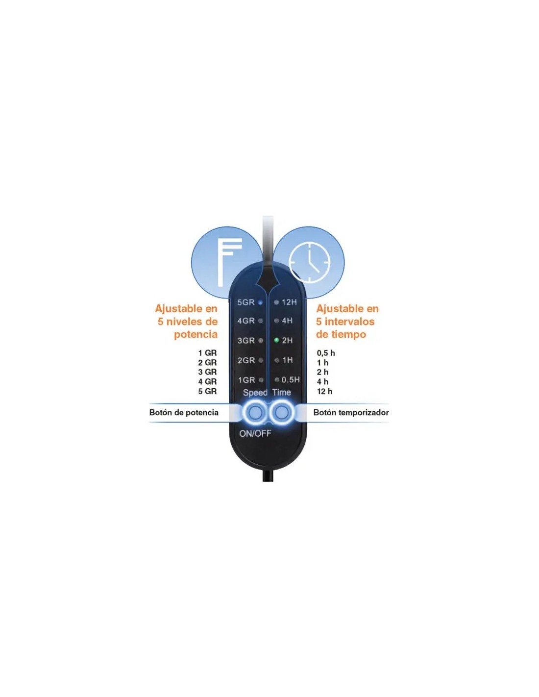 5 velocidades ajustables y temporizador de 30 min a 12 h.